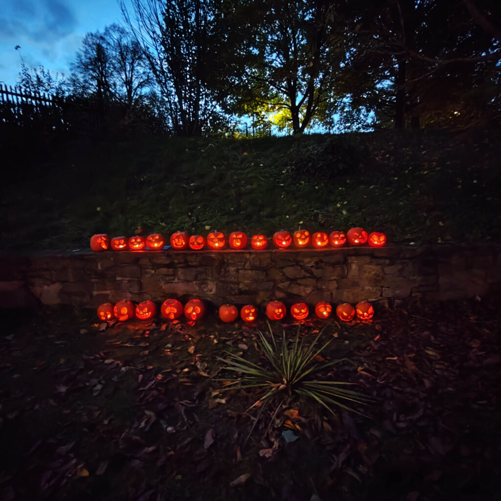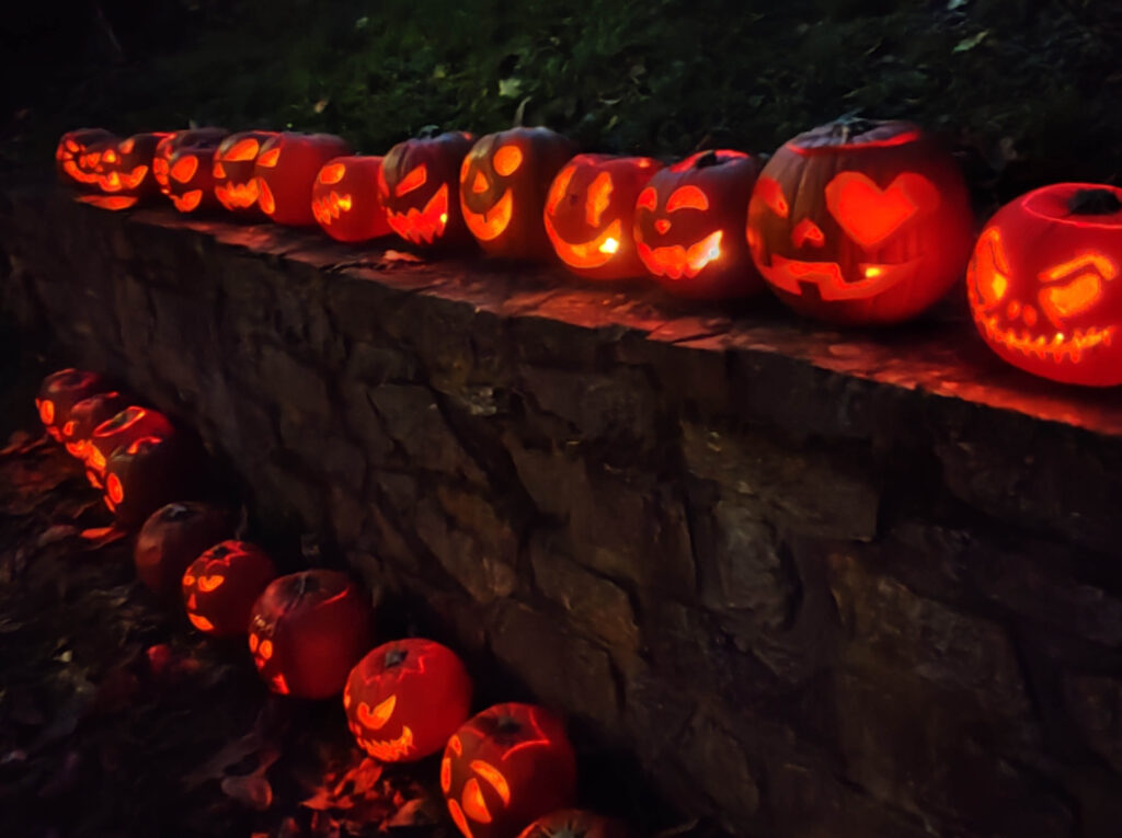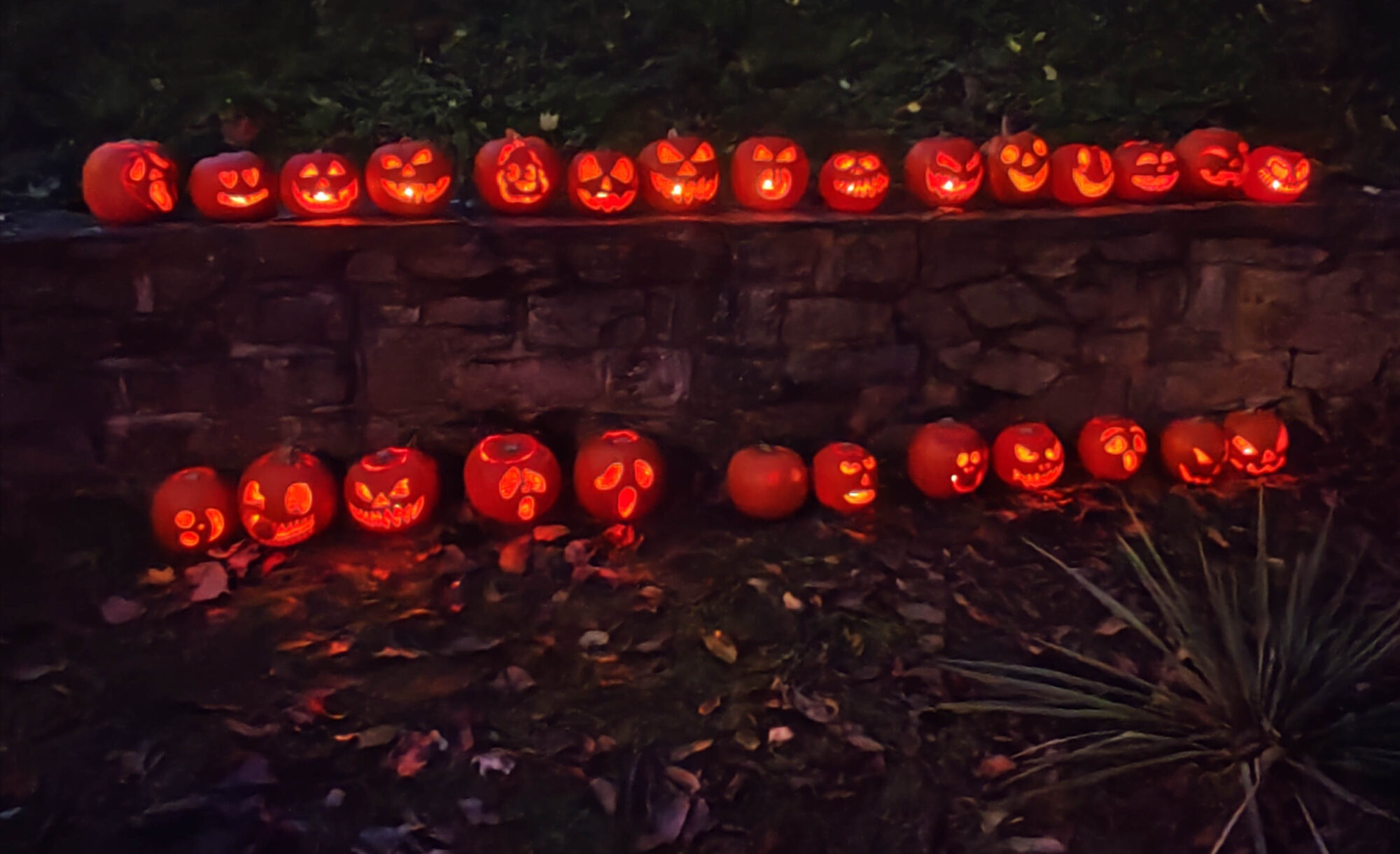 Zum Abschluss wurden die geschnitzten Kürbisse im Pfarrhof auf einer Mauer beleuchtet – ein magischer Moment, bei dem Kinderaugen genauso funkelten wie die Kürbisgesichter. Selbst Mitglieder aus Heidelberg reisten an, um dabei zu sein.